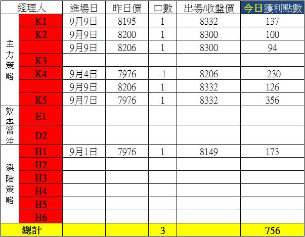 昨日2作多1作空經理人H1與K5、K4,面對今天期指大漲350點,早盤H1經理人隨漲勢停利228點,而K1經理人開始作多,09:43分K2經理人積極作多同時K4經理人停損327點並反手作多,午盤K2經理人停利194點出場,其餘各經理人都沒動作,原策略1作多經理人順本日波段獲利356點;因此整體策略增持至30%多單;