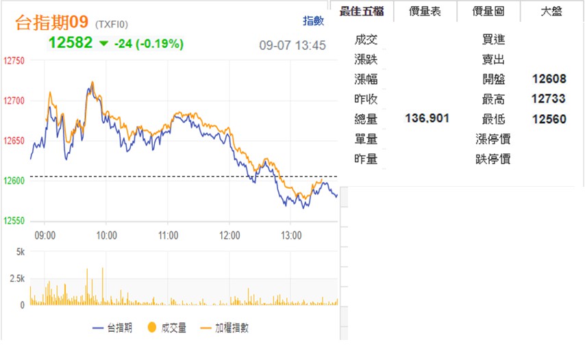 盤後數據:本日2020/09/07(一)今天09月台指期貨盤開平走平,為高低差173點的盤整盤,開在12608收於12582,跌幅24點,早盤期指開高2點,於12675之上下60點區間震盪收斂,盤中尾聲以下降旗形跌115點至12560,尾盤收高20點,總成交量稍擴至13.6萬口,現貨成交量縮至2231億,逆價差縮至19點;上周五外資期貨淨多單連4日擴至2萬9千餘口,短線震盪;
